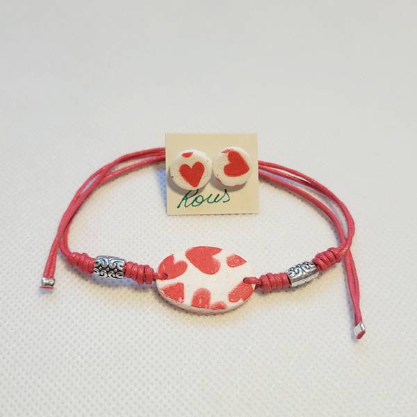 Conjunt d’arracades curtes i braçalet a conjunt. Braçalet ajustable, fet a mà amb peça d’argila polimèrica ovalada amb cors. Les arracades curtes estan fetes a mà amb argila polimèrica i tanca d’acer no fan al·lèrgia i no pesen gens són molt còmodes de portar.