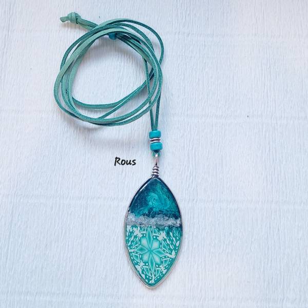 Penjoll llarg “Gota”, te una llargada d’uns 45 cm esta fet a mà amb argila polimèrica i resina, no pesa gens i te una peça amb la que pots tria la llargada del penjoll.
